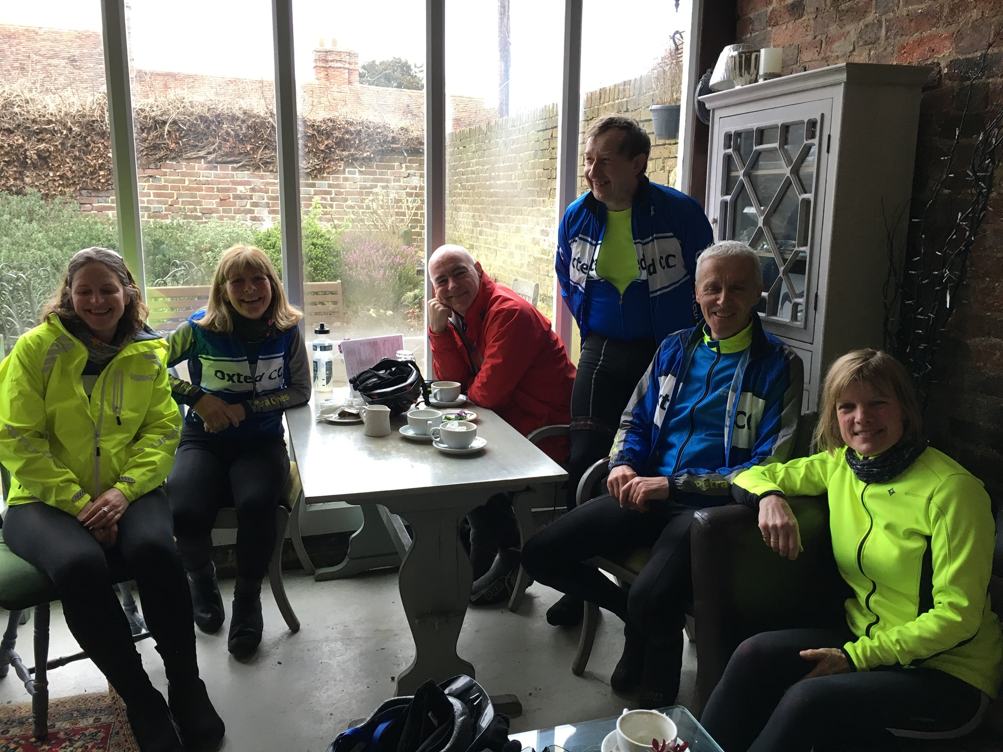 Jane and Amanda, riding ‘Doreen the Dawes’ tandem led an enjoyable social T1 group today comprising Pat, Frank, Neil and Toby, aiming for cuppa at Chiddingstone tea rooms. ‘A lovely route, through Old Oxted to Hurstgreen and Staffhurst Wood, then Edenbridge and then our destination, the pretty Tulip Tree tea rooms’